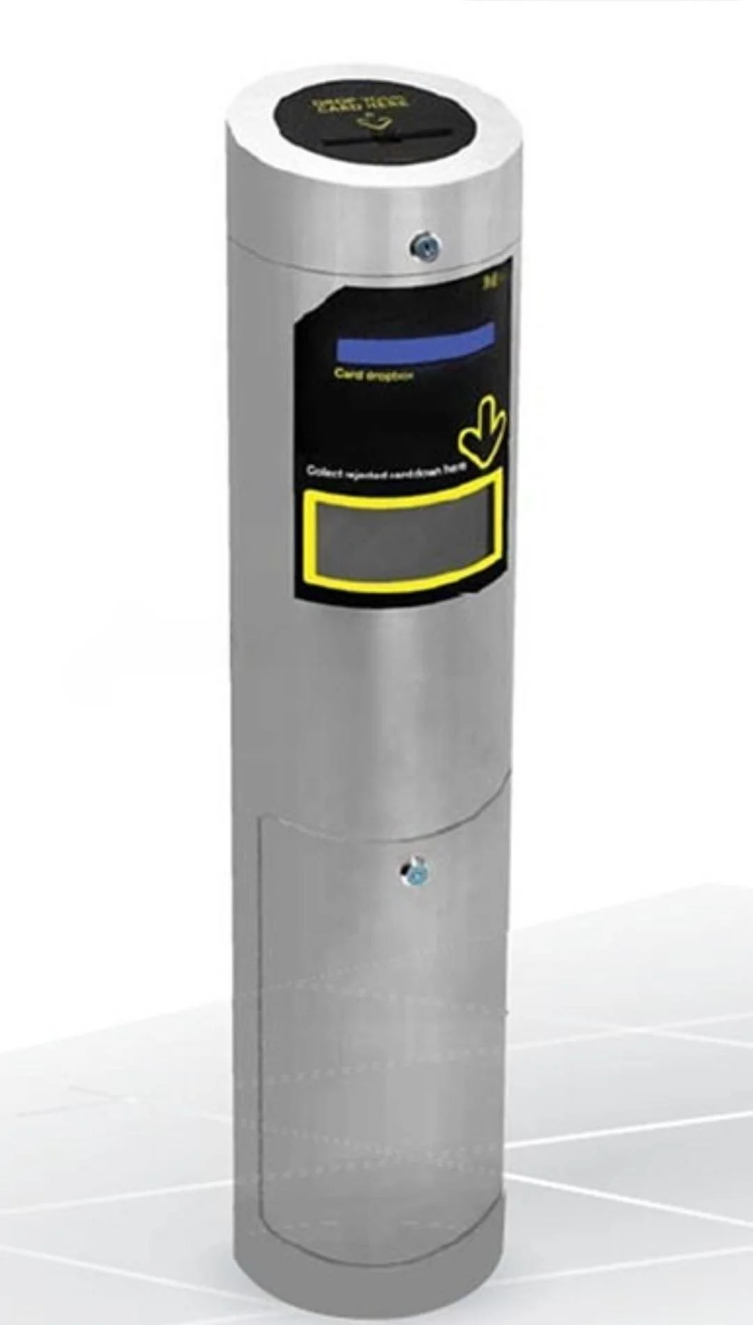 Any brand card reader can be installed inside the dropbox. Once reader verified a valid card, reader shall trigger dropbox to accept the card. Accepted card will fall into collection bin at bottom.