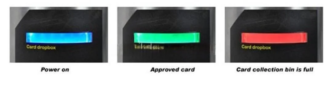 There is indication light to show operation status.Green light indicates the card is valid and card fall in collection box. Red light when fully occupied and the card will be rejected and falls out to exit tray in front.